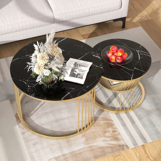 Table basse gigogne ronde avec rangement blanche & noire dorée
